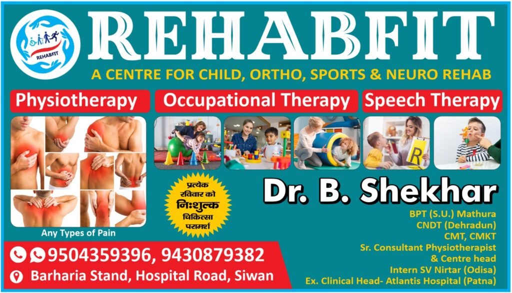At RehabFit Physiotherapy & Rehabilitation Center, Siwan, we are committed to delivering the best physiotherapy, occupational therapy, and speech therapy services to help you heal, recover, and regain mobility. Led by Dr. Bittu Shekhar (Dr. B. Shekhar), our expert team provides personalized, evidence-based treatment for a wide range of conditions.